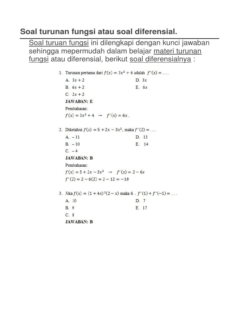 Contoh Soal Turunan Kalkulus 1. Topik pembahasan kalkulus meliputi konsep limit, diferensial atau turunan, serta integral atau anti-turunan. Soal turunan fungsi atau soal diferensial.
